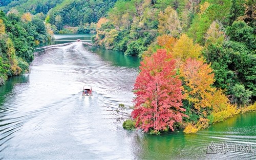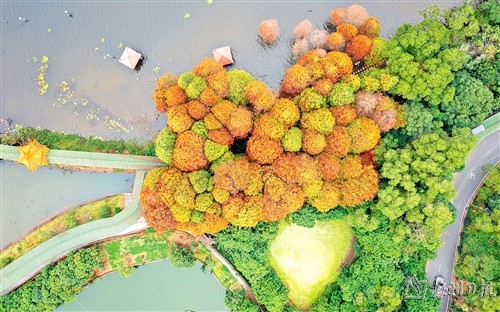 一降温,梅城泮坑旅游风景区内的大片落羽杉就换上了“红妆”,绿中带黄,黄中含红,在冬日阳光的映照下色彩斑斓、美不胜收,成为冬日一抹别样的风景。放眼望去,近处红色的枝叶与远处波光粼粼的水面相映成趣。从空中俯瞰,整片落羽杉林在阳光的照射下色彩缤纷。