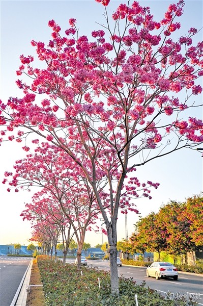 绚丽的花卉点缀了道路,也让这个初冬变得更加温暖。记者近日来到梅城坜明路,只见一路上的紫花风铃木在寒风中悄悄盛放,阵阵微风中,片片紫花风铃随风摇曳,成了城市中心一抹靓丽的点缀。