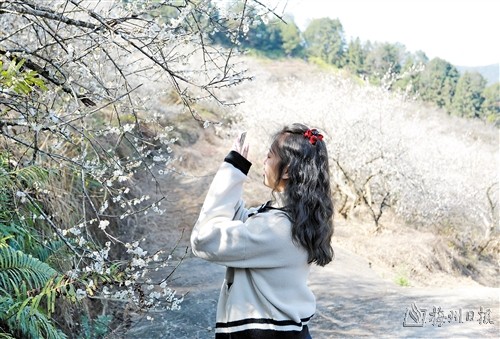 走进雁洋三乡梅花园镇级森林公园,只见漫山遍野的梅花竞相吐蕊绽放,芳香四溢,呈现出“万株梅花浑似雪”的美景。在这片纯白的花海周边,还点缀着几棵“宫粉”梅花,粉红色的花朵点缀在白色花海边显得格外耀眼。“赏梅仿佛是梅州人约定俗成的一种娱乐,每年梅花盛开的时候,我都要约上朋友来拍照打卡,前几天听说三乡的梅花开了,便过来游玩。”市民谢女士说。