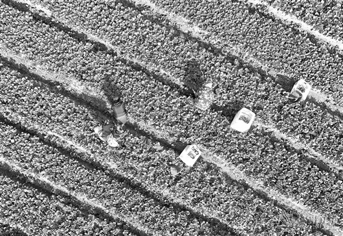 12月27日,工人在鹿寨县江口乡丹竹村蔬菜种植示范基地采收蔬菜(无人机照片)。