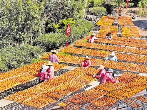 据介绍,“大田柿花”已有300多年的历史,早在明代已为贡品,2017年被审定为中国国家地理标志保护产品。其产地范围为五华县长布镇青岗村、嶂下村等10个村。制作柿花的柿子为果合柿,具有果大核小、肉厚质软、味似蜂蜜、营养丰富等特色。柿花的加工也相当复杂考究,柿果采摘去皮后放置在竹筛上曝晒三五天,然后揉搓成圆饼状,接着日晒夜露约20天,直至水分基本蒸发,表层自然析出白色粉状糖霜,大田柿花的制作才算完成。长布镇拥有丰富的果合柿种植及产品加工经验,目前全镇果合柿种植面积近6000亩,并配套了一系列完善的加工设备。接下来该镇党委、政府将继续加大扶持力度,支持柿花产业进一步做大做强,力争打造万亩柿花产业规模,同时不断健全联农带农机制,让“大田柿花”真正成为百姓增收致富的“希望果”。