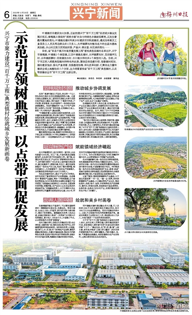 日前,省“百县千镇万村高质量发展工程”首批典型县镇村名单出炉,兴宁市黄槐镇、叶塘镇2个典型镇,以及叶塘镇北塘村、大坪镇潭坑村、龙田镇坪见村、永和镇新寨村、径南镇浊水村、水口镇水洋村共6个典型村入选。当前,兴宁市正深入挖掘典型镇村的特色和优势,围绕坚持党建引领、完善镇村规划、镇村建设先动、强化产业培育、加强基层治理、深化改革创新、汇聚社会力量和推进全域土地整治共八个方面,全力培育首批省“百千万工程”典型镇村,以点带面推动全市“百千万工程”出新出彩。