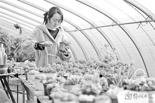 近日,河北省滦州市张坎村一处花卉种植基地的花农在养护多肉植物。