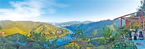 观景台旁边还设置有一个钢架支起的小平台,木质地板上放置着一个秋千架。坐在秋千上,冬日暖阳包裹全身。举目远眺,薄雾早已消散,蓝天如洗,白云如棉,青山如绿波起伏,绿水静谧安澜。一条铁路桥如长龙一般跨桥而过,再一头钻入青山中,最后消失在密林和远方。几十处民居及碧翠菜地、稻田镶嵌在青山绿水之间,一幅清新美丽的生态画卷徐徐展开。我的心情随着秋千慢慢荡漾,摇下三分烦躁二分惶惑五分郁闷,换得十分惬意。(文/图 杨丽君)