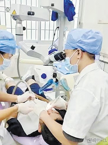 由于黄叔牙齿钙化发生了严重的根管堵塞,用传统方法难以找到根管口进行治疗,市人民医院口腔医学门诊刘宇副主任医师运用新引进的ZEISS口腔显微镜为其疏通两根堵塞的牙齿根管,接着进行后续治疗,让黄叔的痛牙得到根治并完好保留下来。