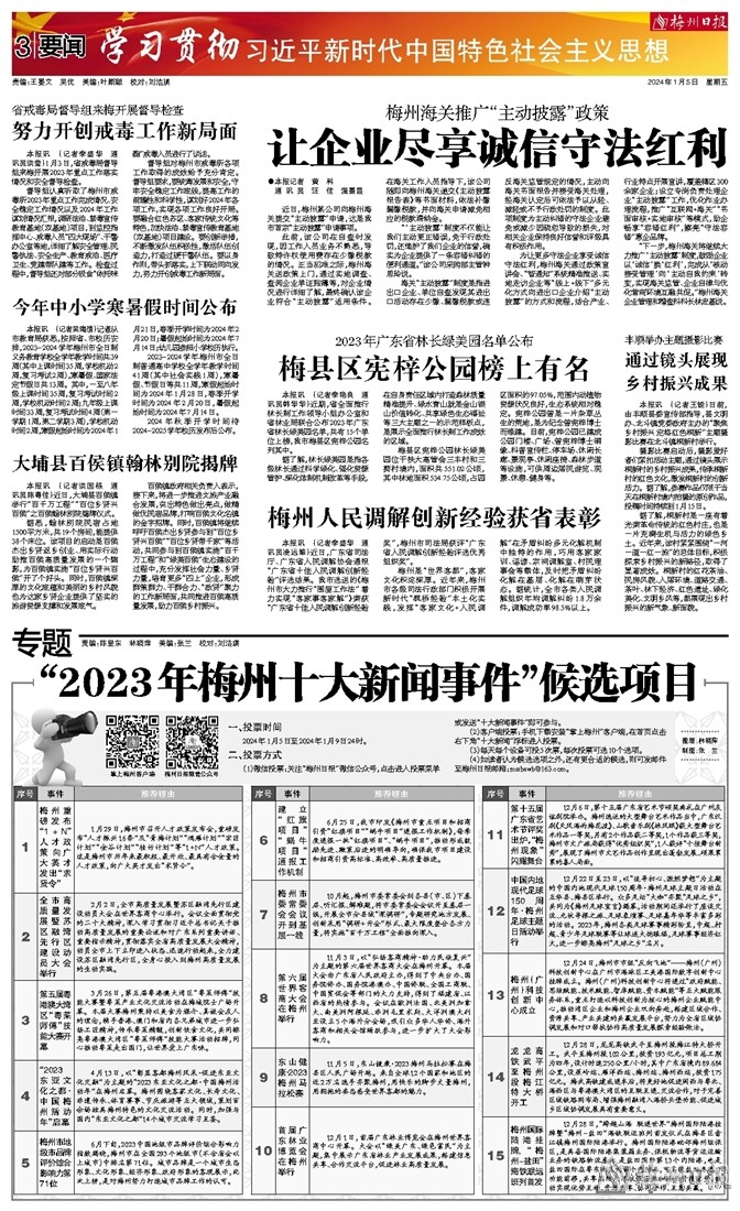 本报讯 (记者吴海清)记者从市教育局获悉,按照省、市校历安排,2023-2024学年梅州市全日制义务教育学校全学年教学时间共39周(其中上课时间35周,学校机动2周,复习考试2周),寒暑假、国家法定节假日共13周。其中,一至八年级上课时间35周,复习考试时间2周,学校机动时间2周;九年级上课时间33周,复习考试时间4周(第一学期1周,第二学期3周),学校机动时间2周,寒假起始时间为2024年1月21日,春季开学时间为2024年2月20日;暑假起始时间为2024年7月14日;幼儿园参照小学校历执行。