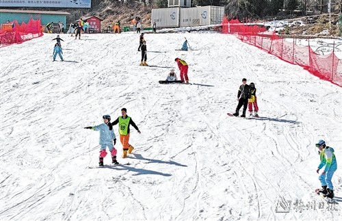 1月6日,游客在潜山市水吼镇天柱山滑雪场体验滑雪。