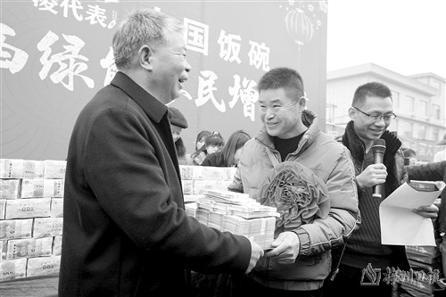 1月8日,凌继河(左)为种粮能手发放奖金。