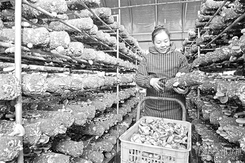 1月8日,村民在邢台市南和区东三召乡一家食用菌种植基地采收香菇。