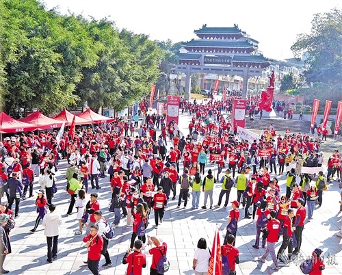 9时20分,笼罩在梅潭河上的浓雾渐渐散开,宛如刚睡醒的美女轻拂身上的纱巾,美色若隐若现。冬日的阳光透过云层,照在党校红色的党徽上,照在队员们喜悦的脸庞上。伴随着一声发令枪响,近3000名户外健身爱好者有序出发,沿着235国道,向三河坝战役纪念园走去。有的队员穿着统发的红色短袖衫,有的穿着各自准备的不同款式、不同颜色的运动服,还有的穿着军人的迷彩服。有擎队旗的,有举队牌的,浩浩荡荡的队伍向前进发,如一条色彩斑斓的巨龙在梅潭河畔前行。沿途的群众睁大双眼看“巨龙”,露出惊奇的眼神,竖起点赞的拇指。沿途指挥交通的警察、应急服务的志愿者也露出满意的表情。或许是因兴奋,或许是因大路的平坦舒适,不少人竟跑了起来,把徒步当成了跑步。有些还一边跑一边喊节奏,一边欢呼。不时又有人停下来摆pose拍照留影……沿途那一个个“八一”标志的红色路灯在阳光下特别耀眼,让人感受到大埔红色文化的底蕴,满眼的青山绿树碧水又让人感受到大埔长寿乡的美丽。