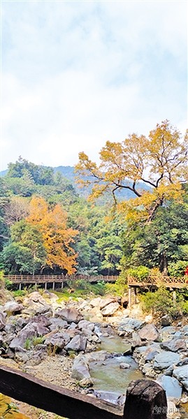 最吸引人的是大峡谷瀑布,高达数十丈,好似瀑布从遥远的天边奔腾而来,如千军万马齐头而下,势不可当。站在观景台上,听着瀑布与鸟儿的合奏,仿若世外桃源。竹柏依然枝繁叶茂,炫出的绿是那么自然,那么特别,那么朝气蓬勃。火红火红的枫叶是冬天最美的叶子,峡谷的百年古枫树与竹柏相映成趣,红绿相间,诉说着冬天的动人情话。小溪边的万年冰臼记录着岁月的痕迹,显示着地质的变化,蕴含了丰富的地理知识。