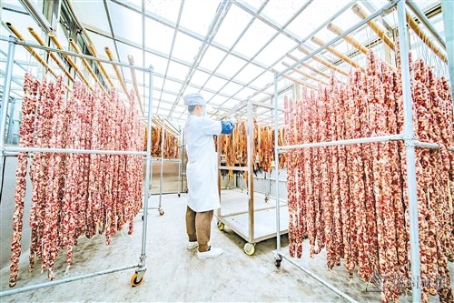 走进位于蕉岭县新铺镇的伍福长寿食品有限公司厂房看到,生产车间内一派繁忙景象,分割、清洗、搅拌、灌肠、晒干,每一道腊味食品的制作工序都有标准的工作间和工作台,工人们各司其职,积极备料,抢抓时间筹备过年餐桌上的那份“年味”。