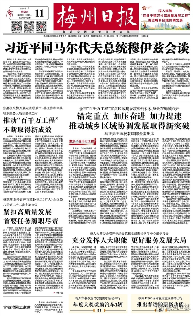 会议强调,要认真学习领会、深入贯彻落实习近平总书记重要讲话重要指示精神。要紧密团结在以习近平同志为核心的党中央周围,把习近平总书记的嘱托和激励化为勇毅前行、不懈奋斗的动力,奋力开创人大工作新局面。要牢牢把握新时代新征程党的使命任务,切实把人大工作置于中国式现代化的战略全局中思考谋划,推动新时代人大工作与时俱进、创新发展。要深刻领会党中央对外工作战略部署,扎实做好华侨民族宗教外事工作,助推梅州不断提高对外开放水平。要聚焦实现高质量发展和构建新发展格局,切实找准人大工作方向,以高质量履职助力我市经济社会发展质效进一步提升。要深刻领会抓好“三农”工作的重大意义,充分发挥市人大机关驻镇帮镇扶村工作队作用,同心协力推进乡村振兴,助力“百千万工程”不断走深走实。
