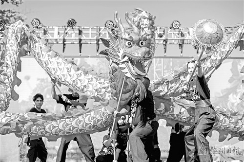 1月13日,演员在智利圣地亚哥举行的春节庆祝活动上表演舞龙。