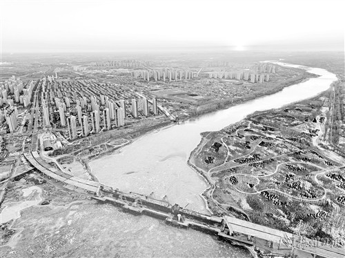 1月15日拍摄的建设中的厂通路潮白河大桥(无人机照片)。
