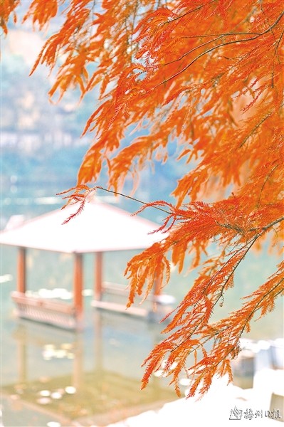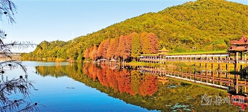 如果时令进入深秋,春夏苍翠的水杉开始慢慢变黄,到了冬季,则变成深红色,给泮坑湖平添秀色。我在湖边观景时,巧遇一群摄影爱好者在拍人物风光照,为美丽的湖光山色增色不少。