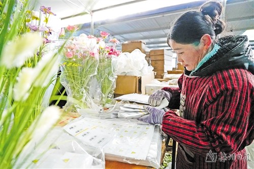 1月16日,乐亭县一家绢花生产企业的工作人员在包装绢花产品。