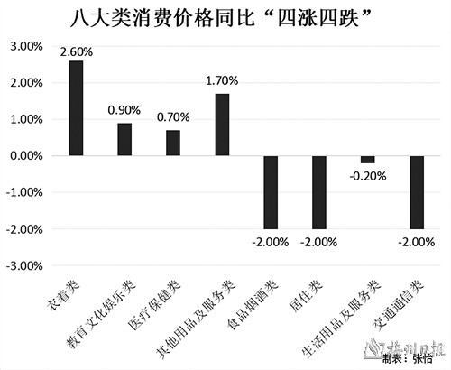 与2023年11月相比,八大类消费价格呈“四跌三涨一平”态势。下跌类别有衣着类、交通通信类、教育文化娱乐类、医疗保健类,跌幅分别为0.2%、1.2%、0.1%和0.1%;上涨类别有食品烟酒类、生活用品及服务类、其他用品及服务类,涨幅分别为0.1%、1.5%和0.4%;居住类价格持平。