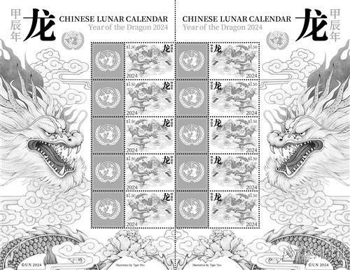 联合国邮政管理局2010年5月首次发行以中国生肖为内容的邮票,到2021年已发行了首轮12张生肖邮票。2024年的龙年邮票是第二轮生肖邮票的第3张,延续了第二轮生肖邮票版张的设计风格。版张左侧5枚邮票和右侧5枚邮票为镜像分布,左侧的龙与右侧的龙对望,增强了趣味性。