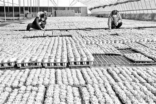 1月22日,村民在水泉村紫仟家庭农场多肉植物大棚内管理多肉植物。