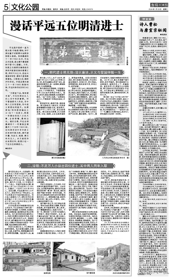 “万般皆下品,唯有读书高”,可见科举在古人的心目中有多重要。对于普通读书人而言,考中举人已非常困难,考中进士更是如同登天。如果某地(特别是较偏远之乡)出了一名进士,那是一件轰动四邻八乡的大事,全家荣耀,桑梓沾光。据史志载,平远自明嘉靖四十一年建县至清嘉庆二十五年(1820)间,在科举考试中考中进士的有明代韩元勋,清代谢升庸、刘述元、姚璋、萧汉申共五人。本文就现存的有限史料,梳理介绍一下这五位明清进士。