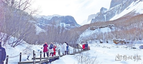 赏完天池,我们下山依次游了长白山瀑布温泉景区和绿渊潭景区。此时竟然下起了纷纷扬扬的雪,我们终于深深地体验到了长白山的雪中情景,实在是运气殊佳。在瀑布温泉景区,在雪山下,在木栈道上,在披满厚厚雪层的木屋旁,在小广场上,在纷纷扬扬、漫天飞舞的落雪中,游客惊呼,欢闹,拍照,跳舞,发抖音视频……好一片欢乐的海洋,迷人的景致。在绿渊潭景区,沿着弯弯曲曲的石板小路,一旁长达数十米的陡峭山壁,长满了各种造型奇特的树木,悬吊着绿玉般晶莹剔透、精美曼妙的各种冰挂、雪花,简直就是一幅幅出神入化的唯美画卷,让游客着迷、惊叹,流连忘返。多年来心心念念向往的长白山,以及感受大雪纷飞场景的心愿,终于让我们圆满地实现了。