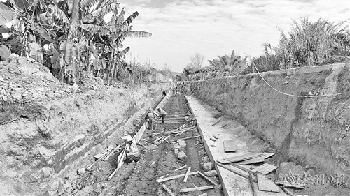 在蕉岭县石窟河沿岸灌(排)渠系改造工程三圳大排渠(吉塘段)的施工现场,蕉岭县水利水电建设中心副主任徐海文和广东水电二局股份有限公司项目施工经理张嘉伦在认真地讨论建设细节。