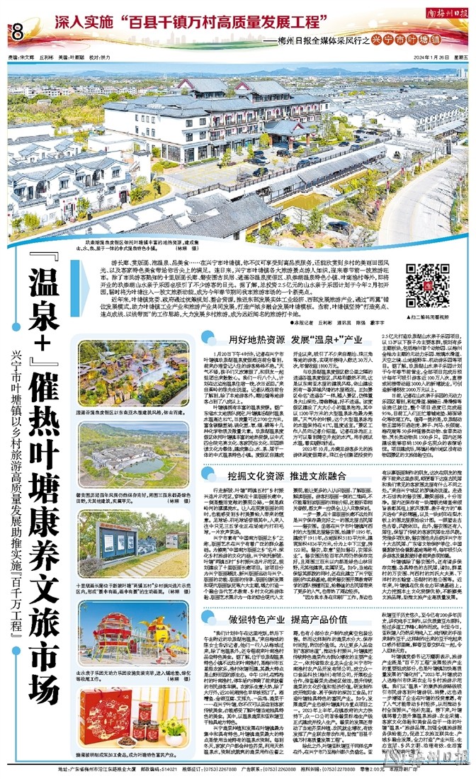 叶塘镇党委书记万耀明表示,旅游产业既是“百千万工程”发展经济产业的重要组成部分,也是叶塘镇加快高质量发展的“催化剂”。“2023年,叶塘成功入选梅州市休闲农业与乡村旅游示范镇。我们以‘温泉+’的康养旅游路线吸引市民游客到叶塘游玩、消费,这也进一步增强了企业在叶塘的投资意愿,有了人气才能带动乡村经济,从而推动乡村全面振兴。”他补充道。接下来,叶塘镇将着力提升集温泉旅游、农业采摘、客家文化体验和美食品尝于一体的叶塘“温泉+”旅游品牌,加强全镇旅游服务供给能力,促进工农旅互联共生、产城乡融合发展,全力打造“产业兴旺、生态宜居、乡风文明、治理有效、生活富裕”的“康养叶塘”。