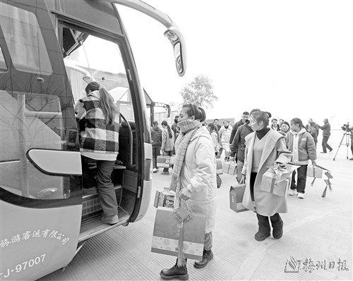 春节临近,浙江省仙居县人力社保局联合企业组织专车“点对点”免费送员工返乡过年,并为返乡员工赠送慰问大礼包,让员工高高兴兴回家过年。