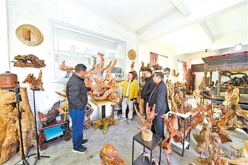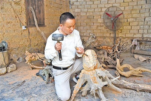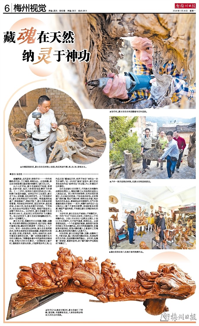 30多年来,廖文忠乐此不疲痴心于根雕艺术,将一件件“朽木”巧妙化为神奇,已制作出上千件根雕作品。大到5米长的《八仙乘龙过海》,小到0.4米长的摆件,无不细节逼真、栩栩如生。从画草图到成品,一个个极富美好寓意,兼具现代审美和传统工艺的木雕作品,成为市民修建新房、添置家具的装饰品,更是木雕收藏人士喜爱的工艺精品,慕名前来定制木雕的人还真不少。