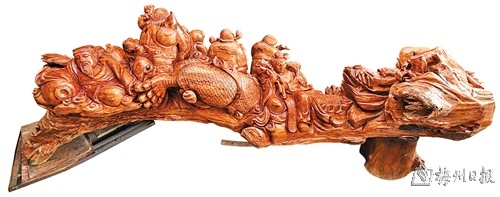 如今走进廖文忠的展厅,不同款式的根雕作品摆放在展台上,精细的雕工以及独特的造型让人流连忘返。笑口常开的弥勒佛、活灵活现的美猴王,仪态端庄的观音,个性张扬的妖怪,还有展翅飞翔的鹰、憨态可掬的熊、栩栩如生的壶,惟妙惟肖的花鸟鱼虫、意境深远的写意摆件,空气中弥漫着淡雅的木香味……其中,根雕代表作品《八仙过海》让人看了不禁拍手称赞,其细致复杂的图案、精致严谨的构图,不难看出廖文忠精妙绝伦的手工艺。