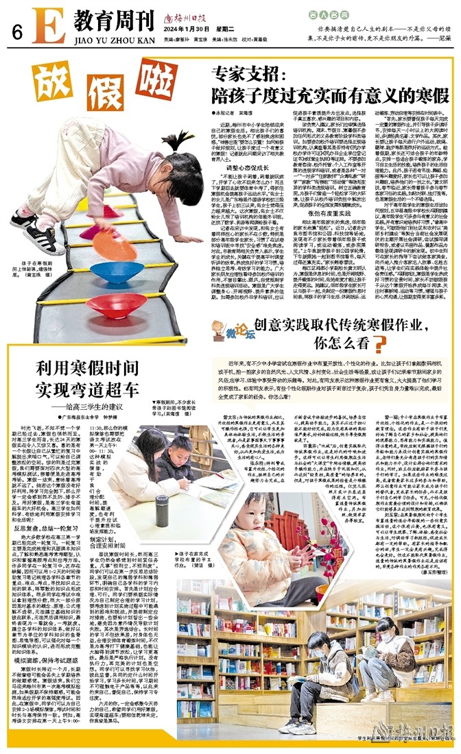 “首先,家长要督促孩子每天完成一定量的寒假作业,并引导孩子多读好书,安排每天一小时以上的大阅读时间,多读经典名著、文学作品。其次,家长要让孩子每天进行户外运动,跳绳、踢球、跑步等都是很好的运动方式。趁着假期,家长还可结合孩子的年龄特点,安排一些适合孩子锻炼的家务,学习自主生活的技能,培养孩子的生活自理能力。此外,孩子若有书法、舞蹈、绘画等兴趣爱好,家长也可以让孩子参加兴趣班,培养他们的一技之长。”黄文丽说,春节临近,家长带着孩子参与春节客家习俗的实践,如贴对联、挂灯笼等,也是寒假生活的一个不错选择。