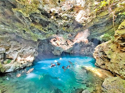 绿窟潭的美具有灵动性。沿着斑驳的树荫逐级而下,映入眼帘的绿窟潭犹如镶嵌在石头中的绿宝石,显得静谧,幽暗,深沉,然而随着光线和视角的贴近,潭水又愈发显得清澈、透亮,明媚。尤其是当潜友宛如水中精灵般荡出层层涟漪,映射在石崖上的粼粼波光幻化成流光溢彩,与灵动的水面交相辉映、美不胜收。