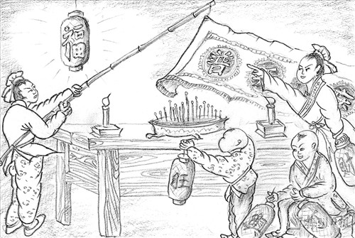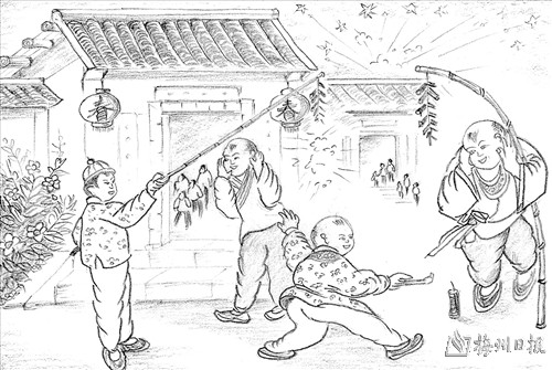 年初一 早开门 放爆竹 喜气新 点蜡烛 装香灯 像前拜 烧纸钱