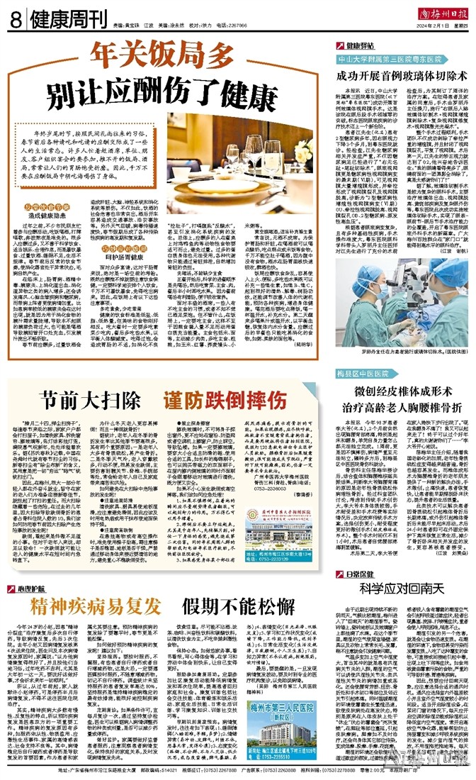 春节前应酬多,过量饮酒会造成肝脏、大脑、神经系统和消化系统等损伤。不仅如此,饮酒的社会危害也非常突出,酒后开车容易造成交通事故、治安事故等。另外天气回暖,病毒传播速度快,春节假期后成了各种传染性疾病的高发期和复发期。