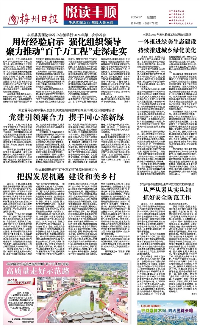 张志锋指出,2023年,丰顺县坚持把全面推行林长制作为落实习近平生态文明思想的有力抓手,深入实施绿美丰顺生态建设“八大工程”,创新开展机关联基层共建共管绿美丰顺大行动,持续推进城乡绿化美化,加大森林资源管护力度,全社会爱林护林观念持续深化,森林资源综合效益不断提升。今年是深入推进绿美丰顺生态建设的关键一年,全县各级各部门要进一步提高政治站位,切实增强全面做好林长制工作的思想自觉和行动自觉,推动绿美丰顺生态建设再上新台阶。