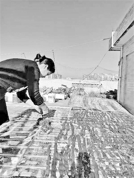 前段时间是冬晴的天气,湛蓝的天空,火热的太阳。我到自家套房顶楼天台晒太阳,不由感叹:这真是“冬晒”的最佳时机呀。这不,抬头一看,邻居谢姐正在此晒着自制的猪肉干呢(如图①)。