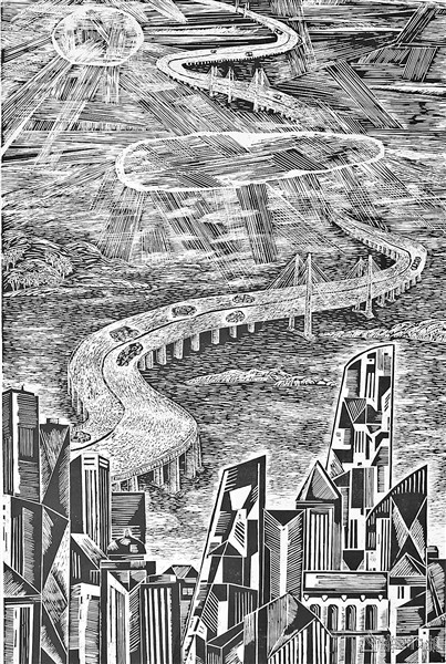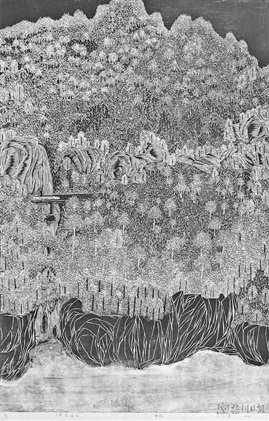 | 三等奖:刘小霞《天堑变通途》 (版画,120×90cm) |