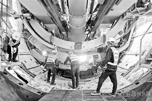 2月5日,建设者在南珠(中)城际十涌站调试左线盾构机管片装配设备。