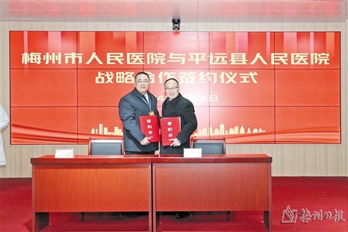 本报讯 为实现优质医疗资源下沉,进一步提升县级医院诊疗水平及服务能力,1月26日,梅州市人民医院院长钟志雄带领医院专家团队到平远县人民医院,双方签订专科共建战略合作协议,并举行心血管内科、介入诊疗中心、神经外科等共建专科揭牌仪式。平远县委书记、县长周小勇,县委常委、办公室主任张锡洪,副县长王平梅,县政府办公室党组成员凌宏风,县卫健局局长肖洪海,县人民医院党政班子成员等出席活动。