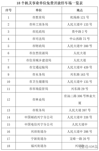 本报讯 为有效缓解城区道路交通拥堵和停车难问题,确保春节期间城区道路交通安全、有序、畅通,兴宁市政府决定从2024年2月10日(农历正月初一)至2月17日(农历正月初八)城区18个单位停车场临时免费对外开放,供广大市民朋友临时停泊车辆。
