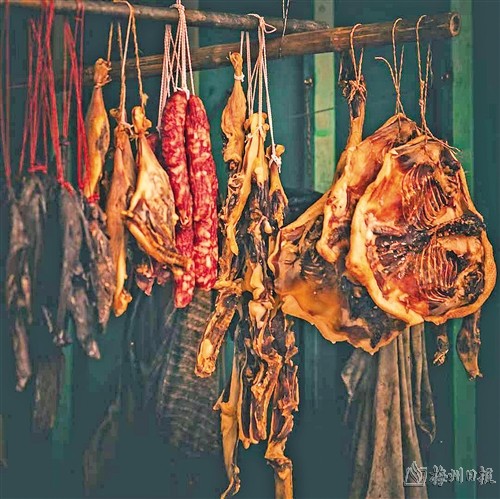 腊月第一件事是腊年货,在兴宁人眼里,万物皆可腊,有了腊味才像过年。在门坪,在阳台,在天棚,到处晾晒着腊味,蔚为壮观,腊肉、腊鸡、腊鸭、腊鱼、腊灌肠、腊猪肝……香气四溢,传递着浓浓的年味。虽然超市有方便的腊味选购,但远远抵不上用自家的传统方法制作出的腊味。过年的时候,家家户户餐桌上少不了一道腊味拼盘,用来飨客,无不赞美;或者亲戚间互换着尝一尝比一比,看看谁家的腊味抢到了北风萧萧而又阳光明媚的好天气,腊制出黑红油亮、咸香适口的冬季特色美食。腊味不但是舌尖上的享受,更是连接情感的纽带,每一位兴宁人,都渴望过年的时候准时回家,美滋滋吃上一口家乡的腊味,满足口腹到心灵的历程,用味觉来记住乡愁。