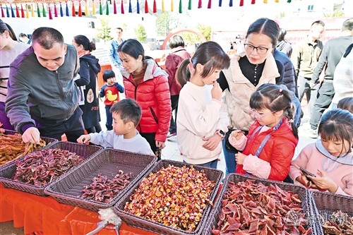 留隍橄榄、牛肉干、臭豆腐、冰糖草莓等美食琳琅满目,吸引众多市民和游客驻足,在热闹的氛围中感受浓浓的年味。