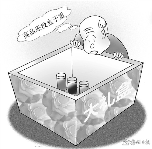 “一件大礼盒,居然就放了3小罐黑芝麻糊。把它们并排摆放好,体积不足礼盒的四分之一。”近日,河南灵宝的姚先生买了一套无蔗糖黑芝麻糊礼盒拿给父母,没想到却被埋怨。姚先生的遭遇并非个例。有媒体调查发现,临近新春佳节,不少商家推出了精美礼盒,但一些礼盒明显存在过度包装之嫌,不仅华而不实,而且让一些消费者质疑自己是在“为包装买单”。陶小莫/图