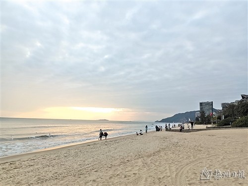 海水清清的,蓝蓝的,像千军万马奔腾着咆哮着汹涌向前,一波又一波,回环往复,不惧疲累。浪花是多么美啊!卷成一个个弧形或圆形的图案,努力向上,再向上奔涌、翻滚。溅出来的水花拍打在沙滩上,像给沙子冲凉,被冲洗过的沙子柔顺地平躺在沙滩歇息。偶尔几滴调皮地溅落于我们的身上,似乎在和我们嬉戏。见海浪退去,我们迎上去靠近大海,见海浪澎湃而来,我们又快速退离,大家就这样嘻嘻哈哈地与海浪玩闹着,驱走了天气寒冷无法畅游海洋的寂寥。