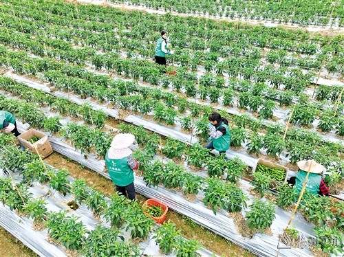 日前,记者走进位于枫朗镇溪背坪村的辣椒种植基地看到,一株株翠绿油亮的航天椒长势旺盛、挂满枝头,在基地务工的村民穿梭其间,忙着采摘、装筐。据梅州市寮里农业旅游发展有限公司负责人周兆裕介绍,基地的务工人员均来自当地,日薪有130元;自基地建成以来,通过“公司+基地+农户”的模式,在助农增收的同时也带动了周边村民就地就近就业。