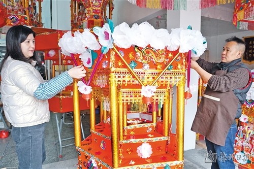 记者采访时,他正小心翼翼地把一朵纸花糊在半成品的花灯上,旁边还摆放着许多已经制作好的花灯。“从农历十二月开始是最忙的时候。”吴镜彬说,旧时制作花灯是一项很吃香的手艺,然而20世纪70年代,祖传的花灯生意曾中断过一段时期,直到改革开放后,花灯和兴宁赏灯民俗再次受到人们关注,其父才重新开始制作花灯。他表示,若不是父亲的坚持,或许这门祖传技艺到他这辈就传不下去了。所以即便做花灯很辛苦,但他愿意为传承传统文化贡献一份力量。