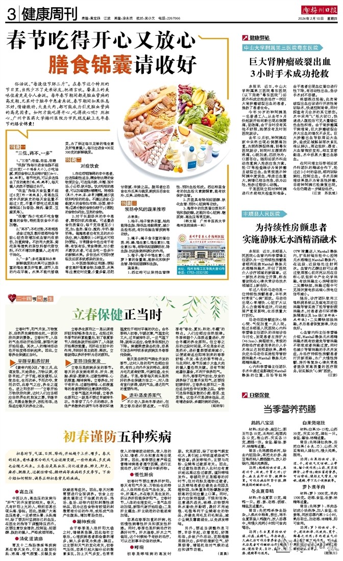 俗话说,“每逢佳节胖三斤”。在春节这个特别的节日里,当然少不了走亲访友,把酒言欢。餐桌上的美味佳肴更是令人垂涎。每年春节期间都是脑血管病的高发期,尤其对于脑卒中患者来说,春节期间如果休息不好,情绪激动,大鱼大肉,都可能成为引发脑血管病的高危因素。如何才能吃得开心,吃得放心呢?别担心,广州中医药大学梅州医院为市民朋友献上龙年春节的膳食锦囊!