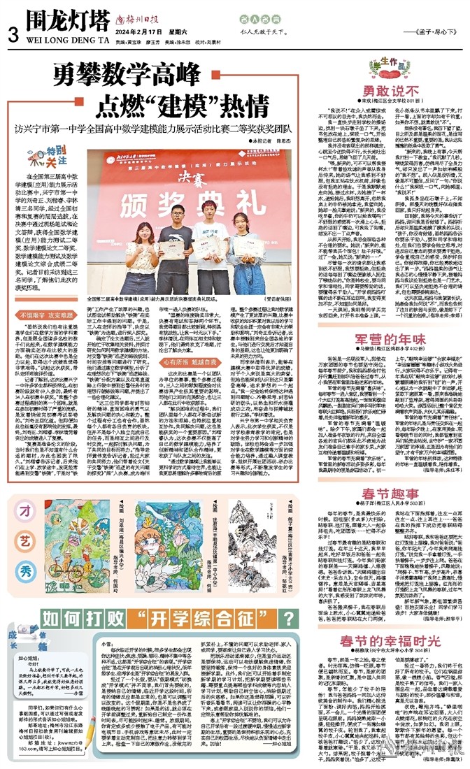 在全国第三届高中数学建模(应用)能力展示活动比赛中,兴宁市第一中学的刘奇正、刘楷睿、李林清三名同学,经过全国初赛和复赛的层层选拔,在决赛中通过现场笔试和论文答辩,获得全国数学建模(应用)能力测试二等奖、数学建模论文二等奖、数学建模能力测试及数学建模论文综合成绩二等奖。记者日前采访到这三名同学,了解他们此次的获奖历程。