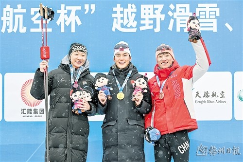 当日,在内蒙古乌兰察布市凉城滑雪场举行的第十四届全国冬季运动会冬季两项公开组男子15公里集体出发比赛中,辽宁队选手胡伟耀以44分13秒8的成绩夺得冠军,辽宁队选手李学志和内蒙古队选手渐凯歌分别获得亚军和季军。(新华社发)